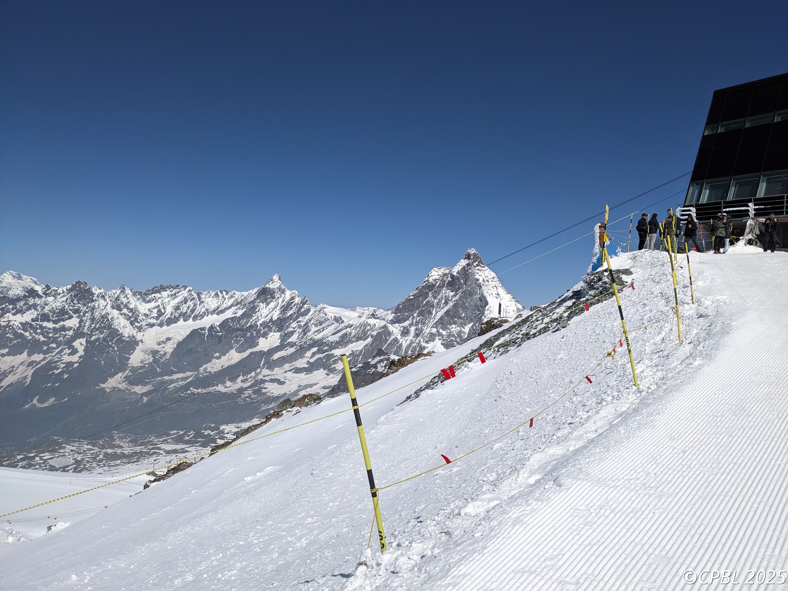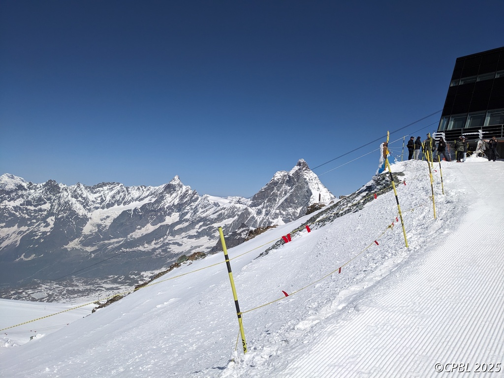 | The next morning, we reclimbed the regroomed ski slope --- yes, with axes and crampons -- to Kleine Matterhorn and descended to town. |