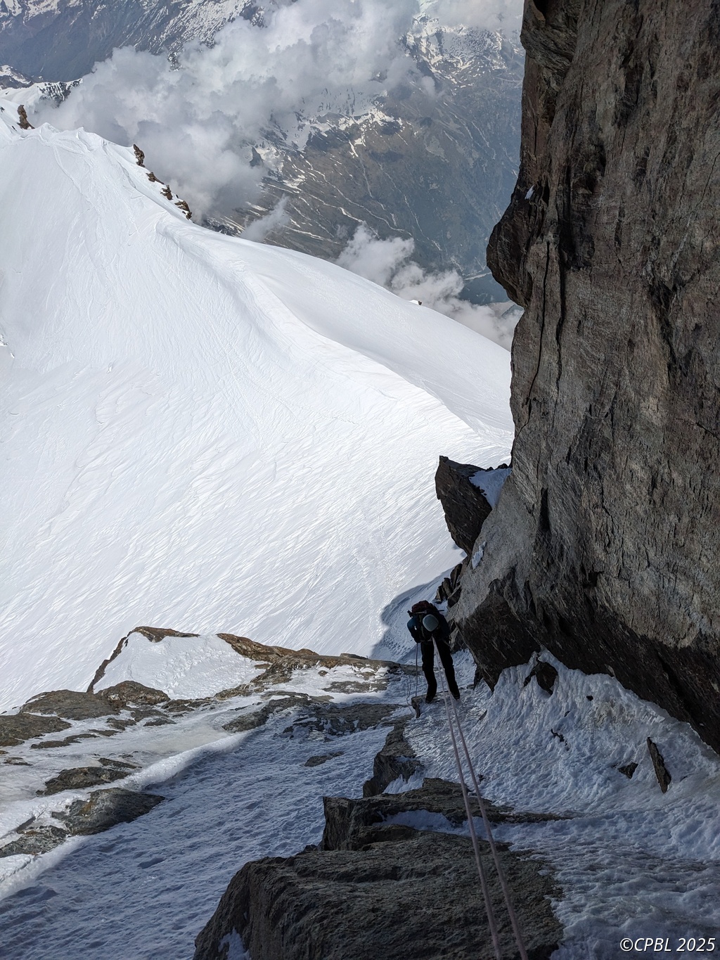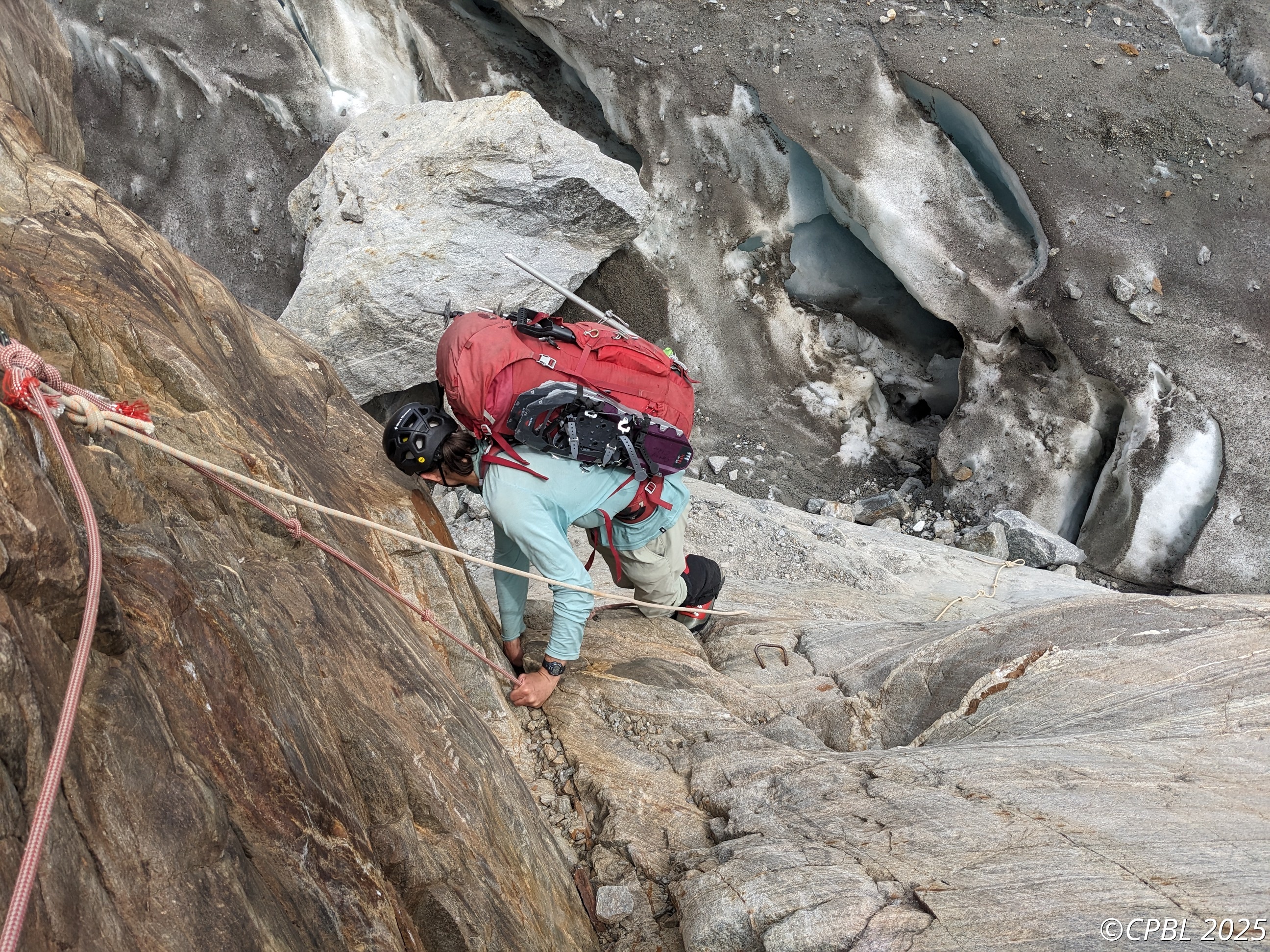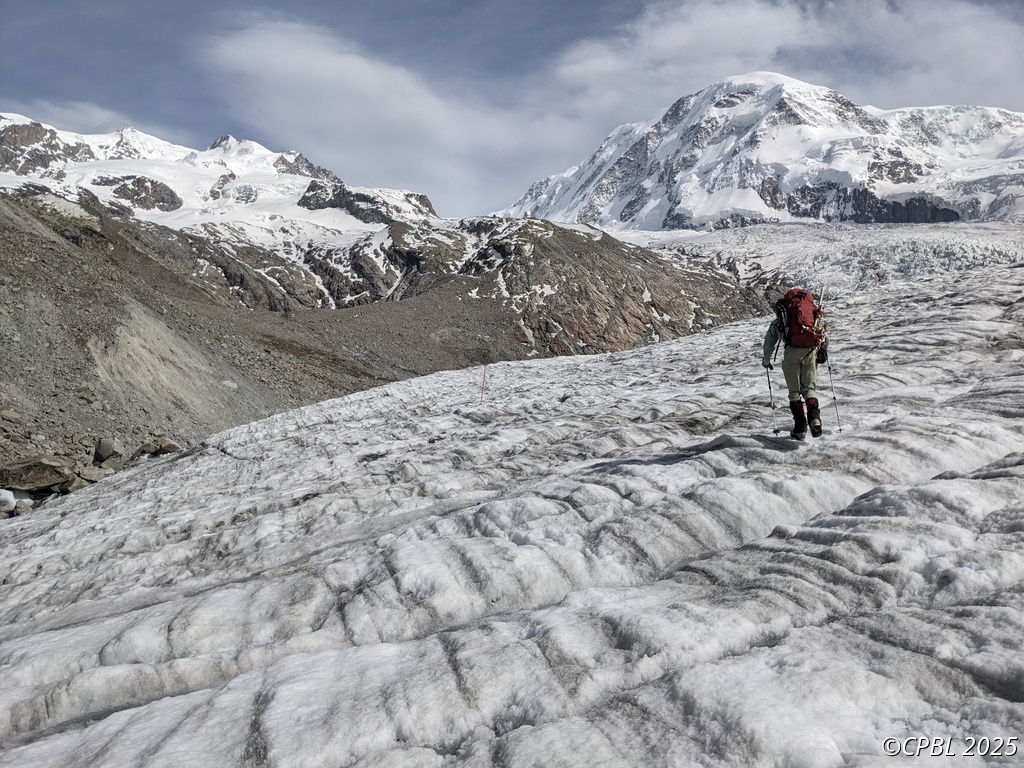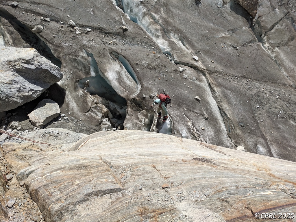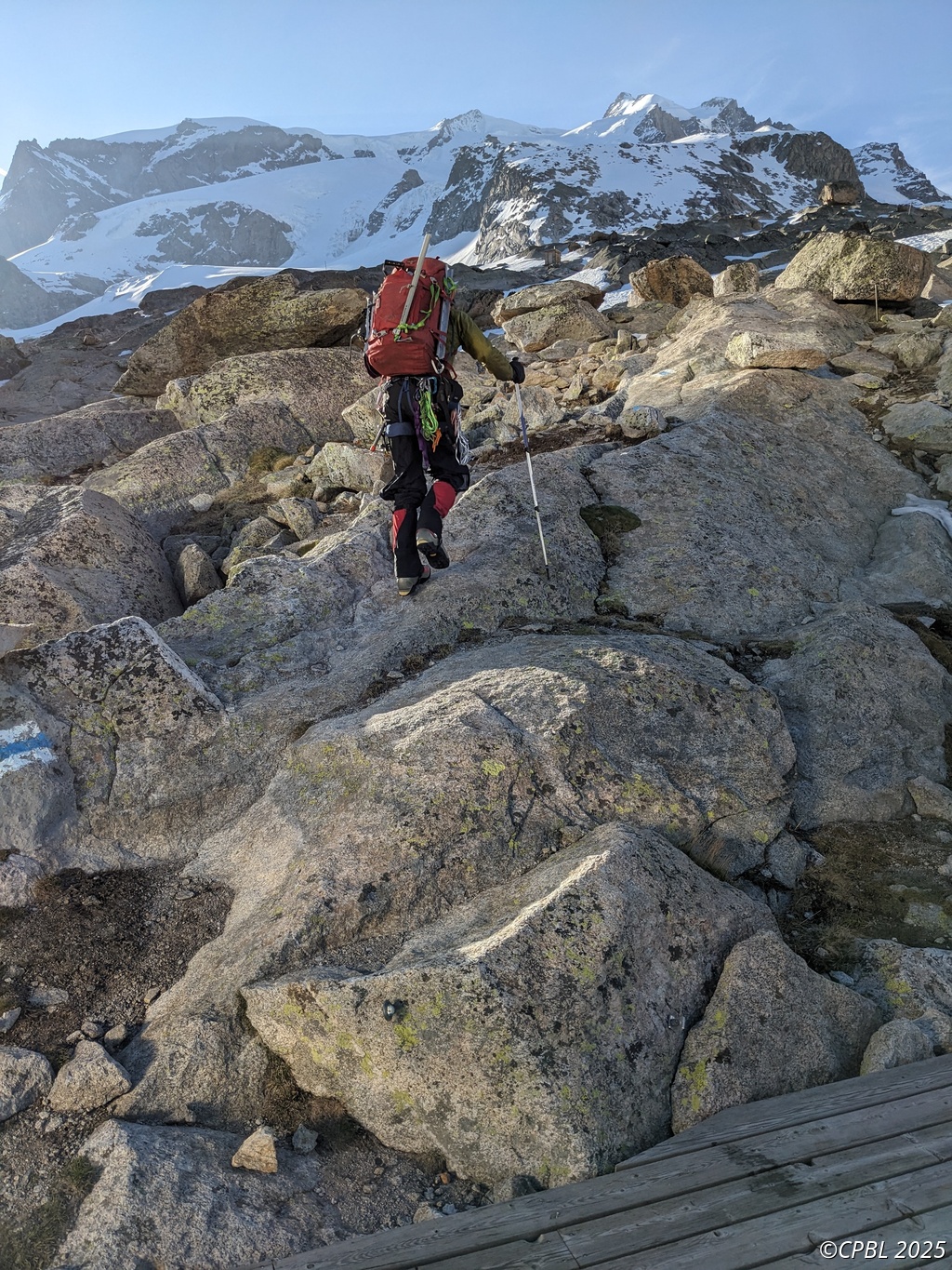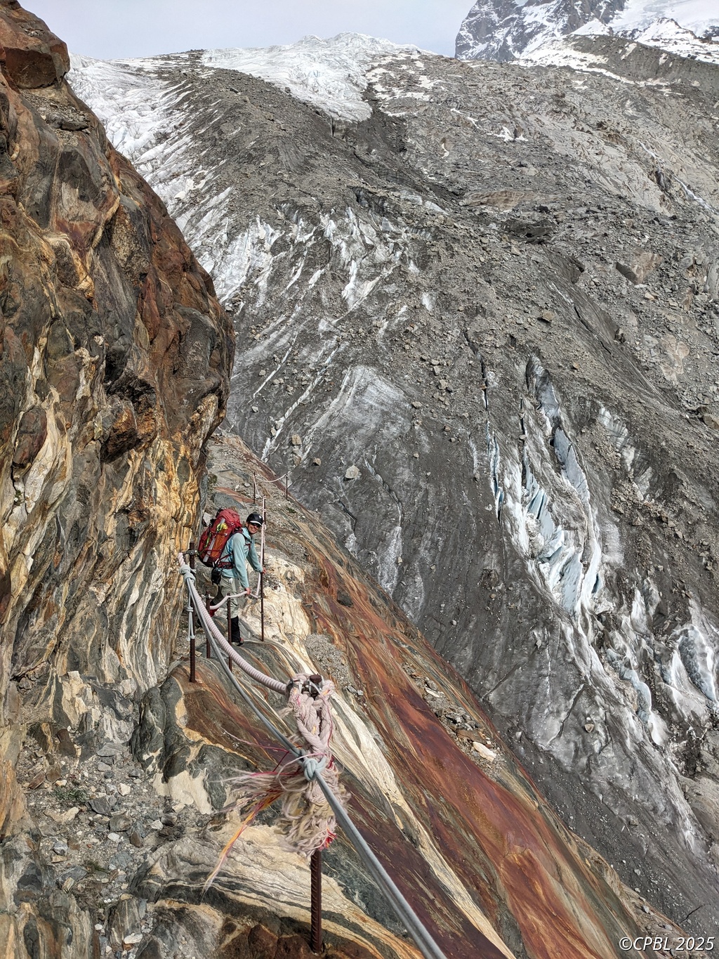| involves fixed ladders and some batman ropes for a transition from rock to the Gornergletscher. |