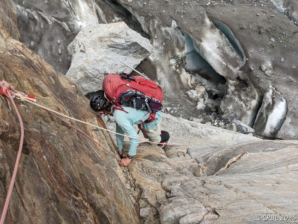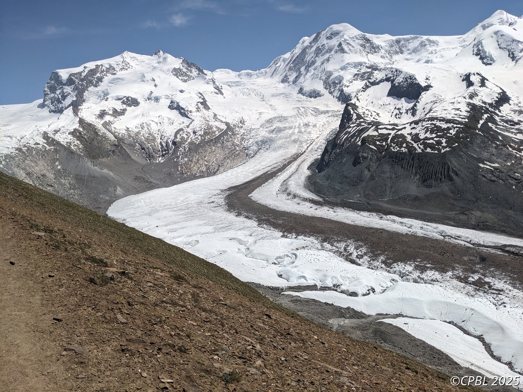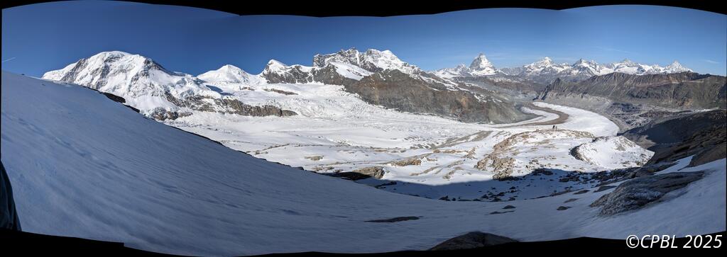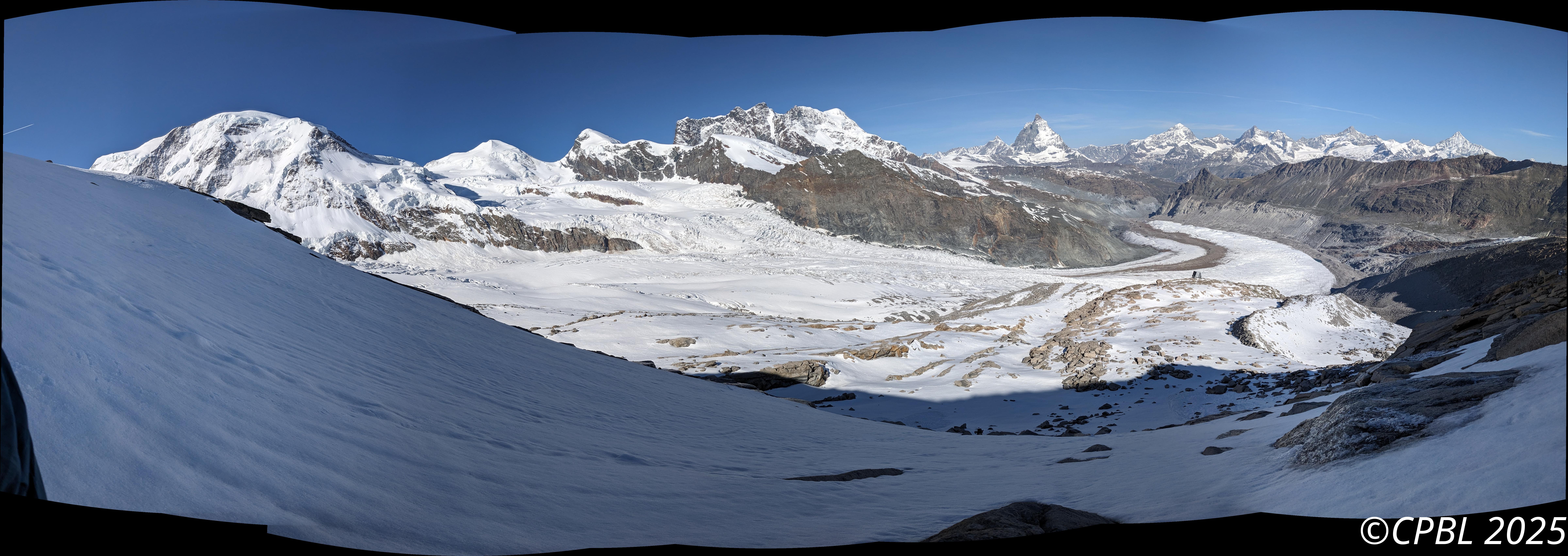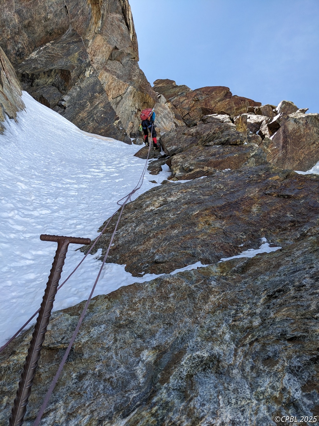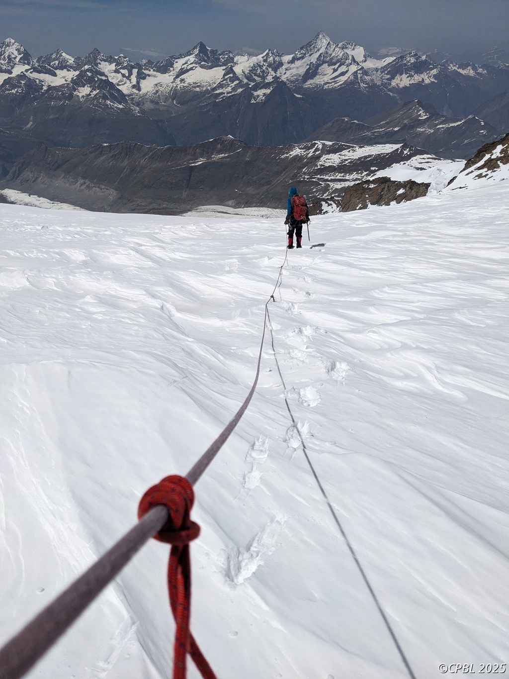 | involves fixed ladders and some batman ropes for a transition from rock to the Gornergletscher. |