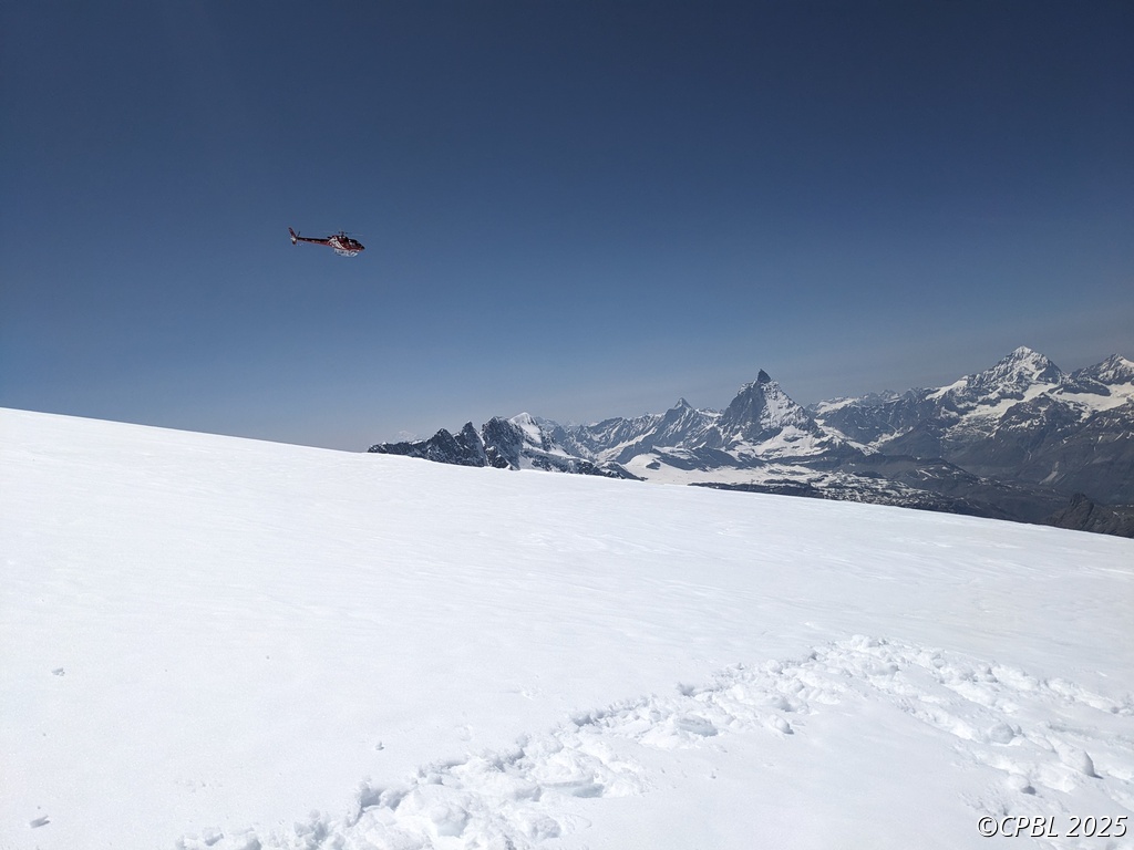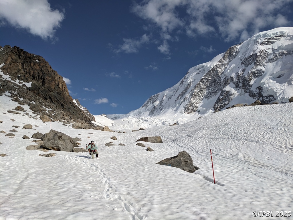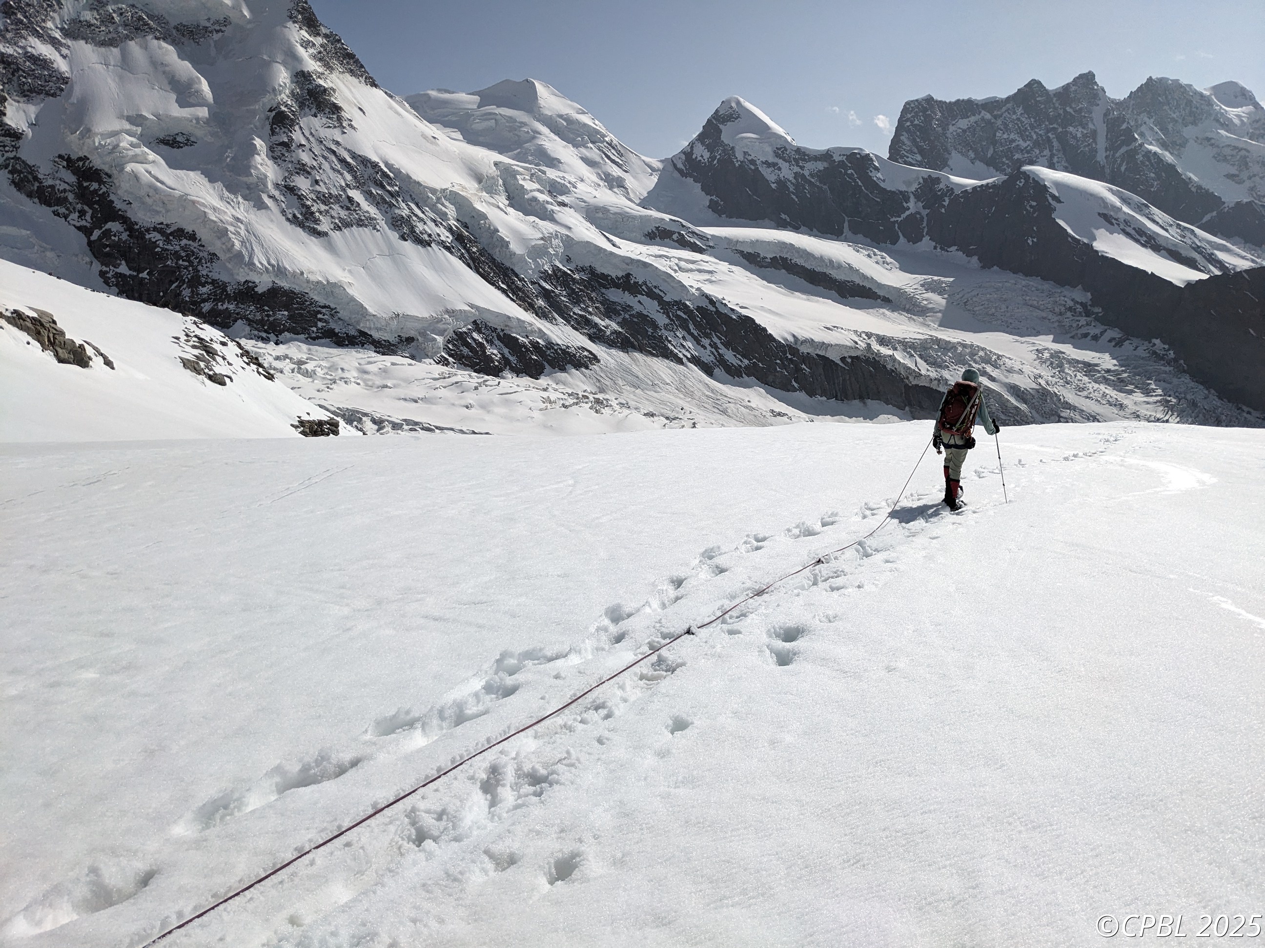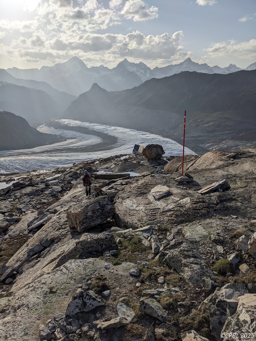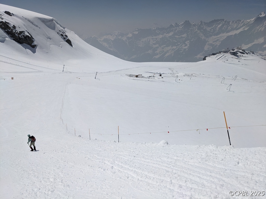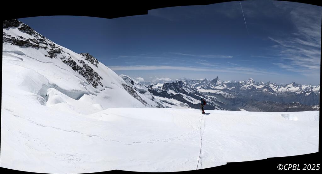 | involves fixed ladders and some batman ropes for a transition from rock to the Gornergletscher. |