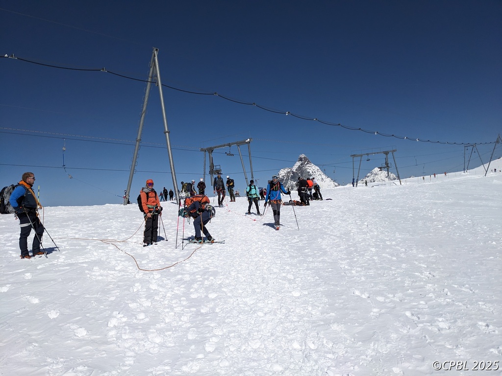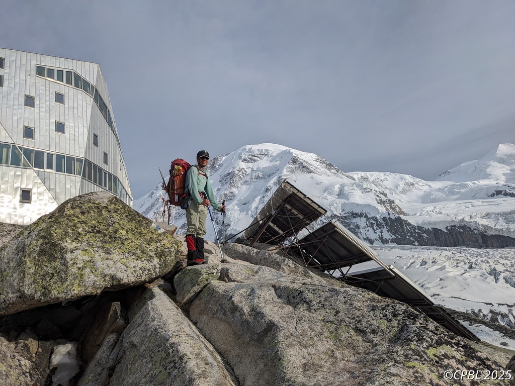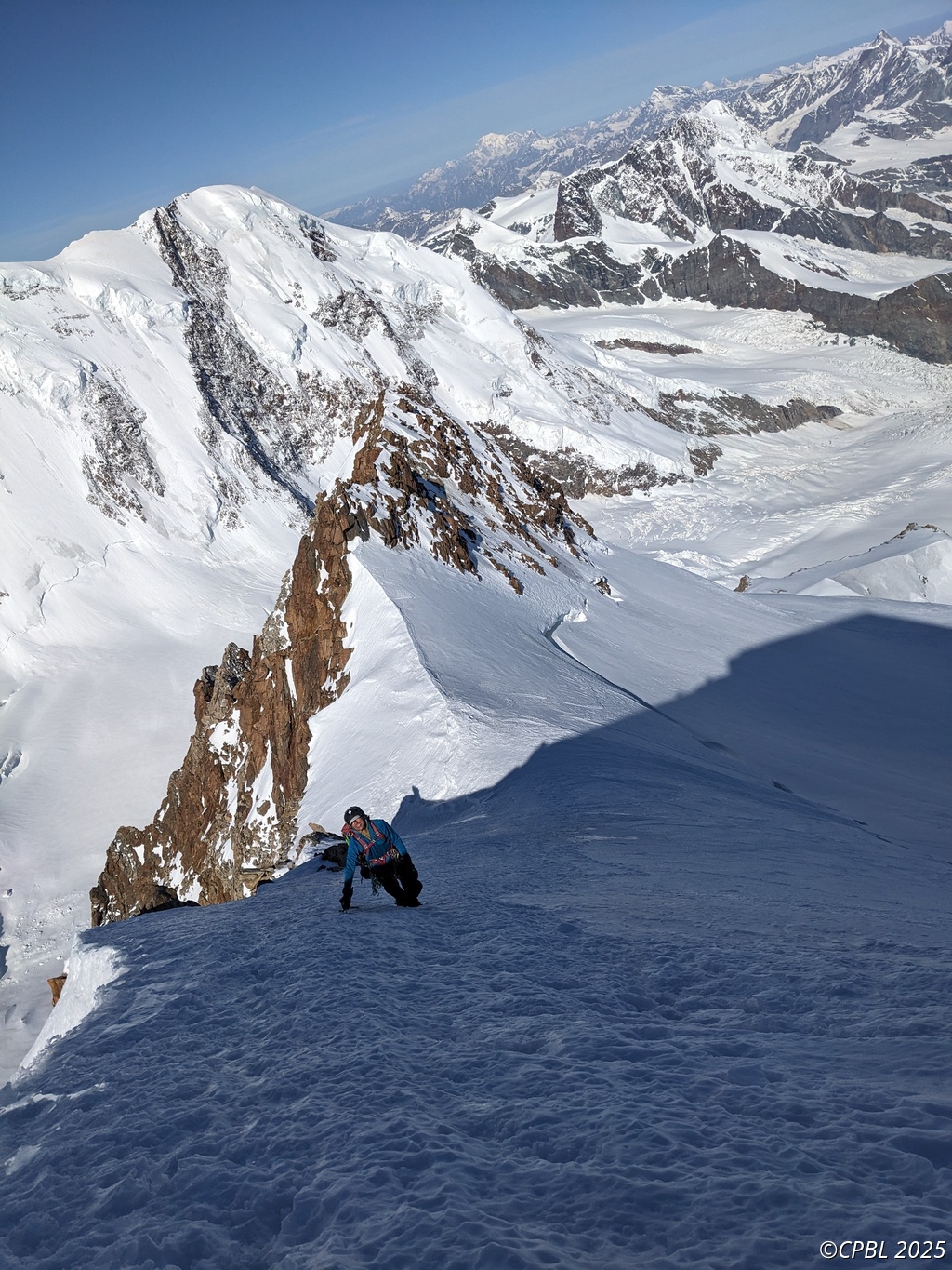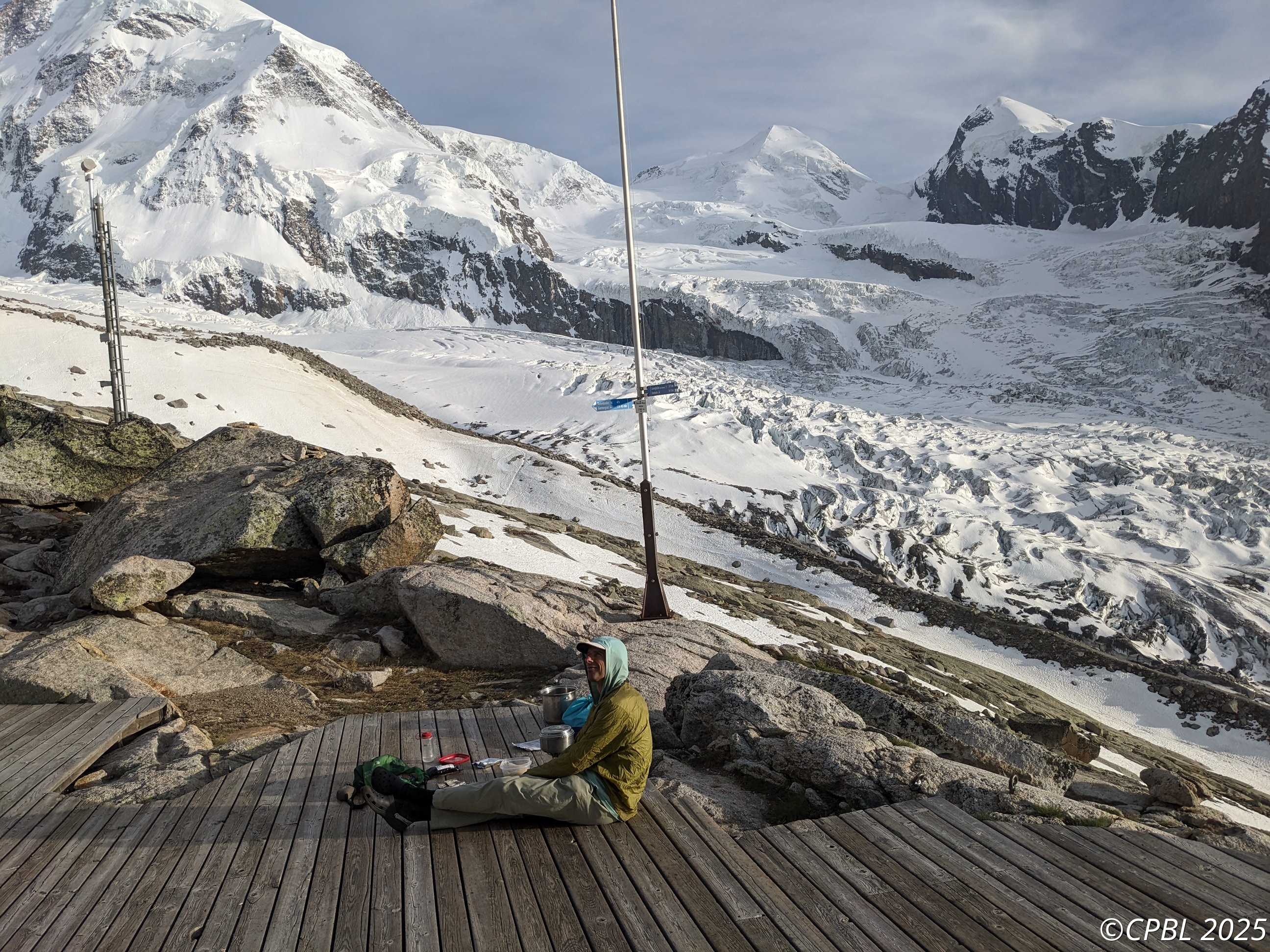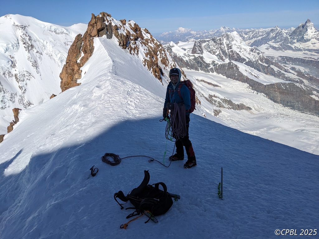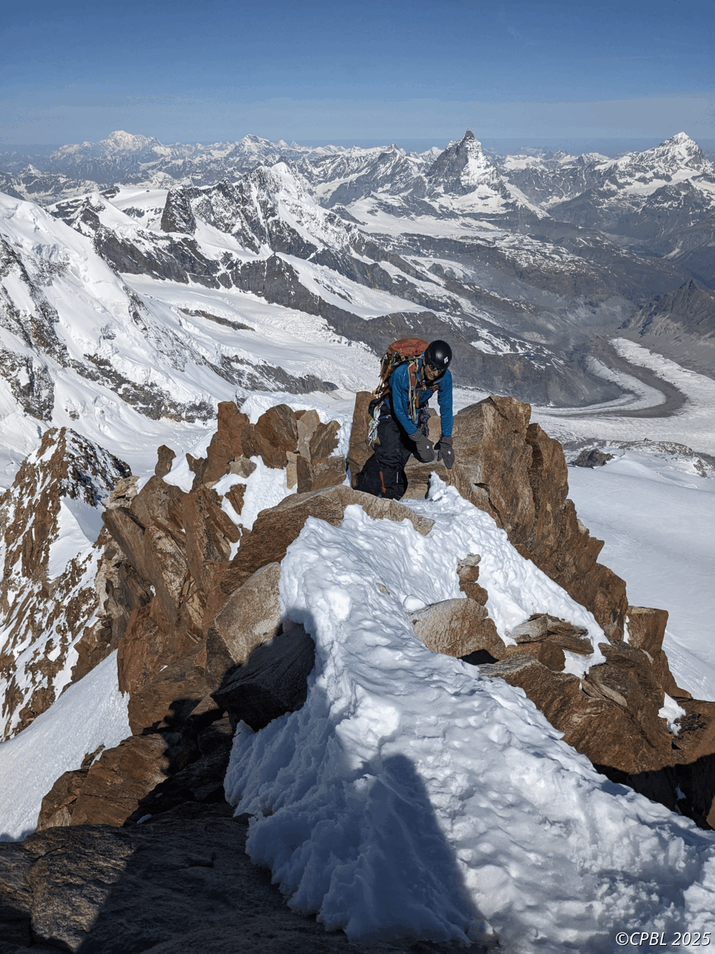 | involves fixed ladders and some batman ropes for a transition from rock to the Gornergletscher. |