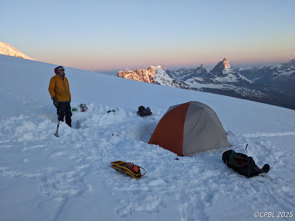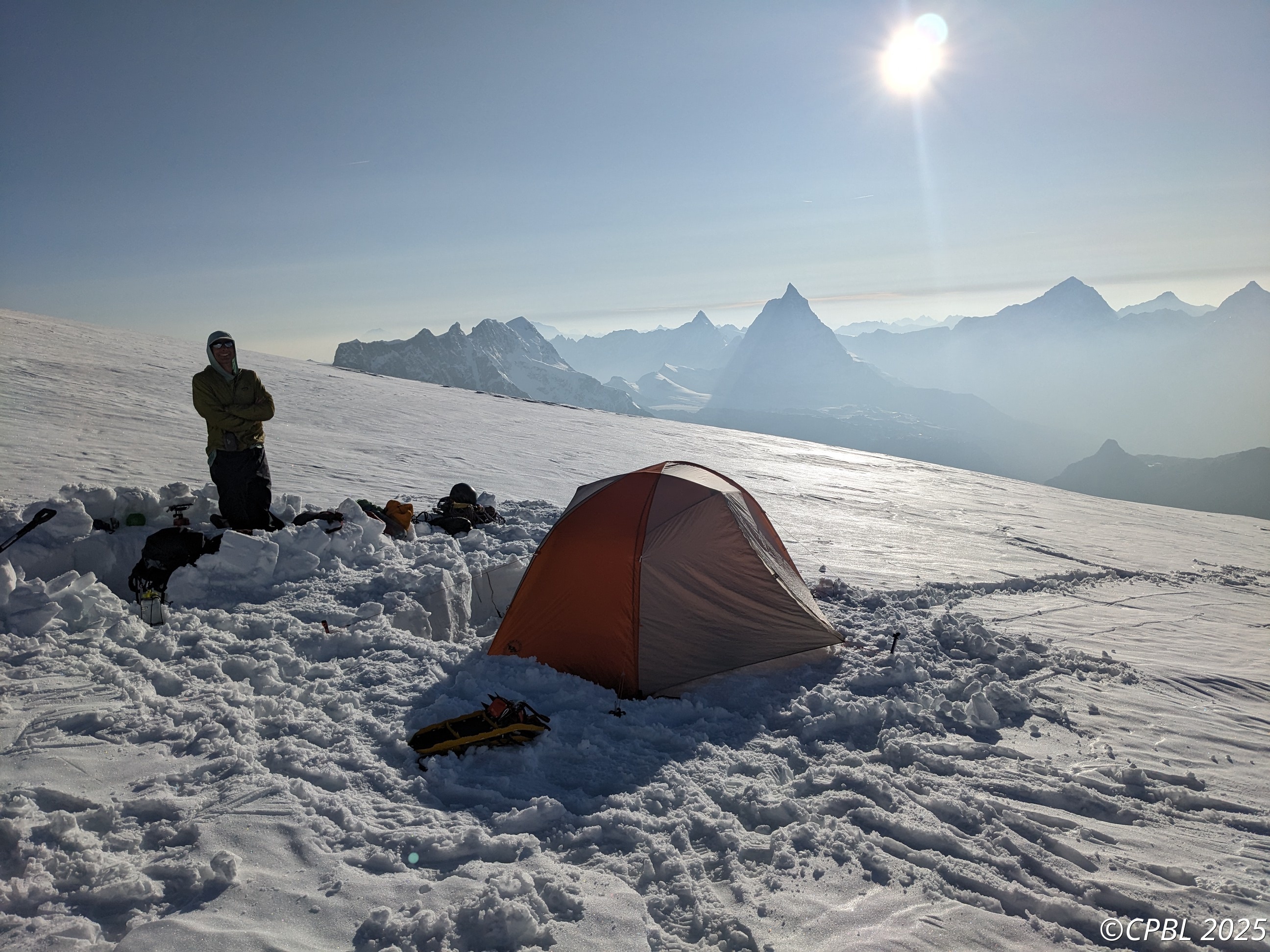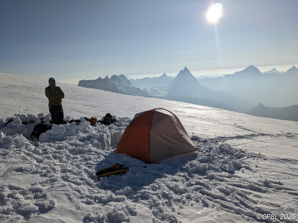 | Our tent was not four-season, but the weather was dead calm overnight. We anchored the tent with things we weren't using for the summit, and chose another leisurely departure in the morning. This time, that was a mistake. |