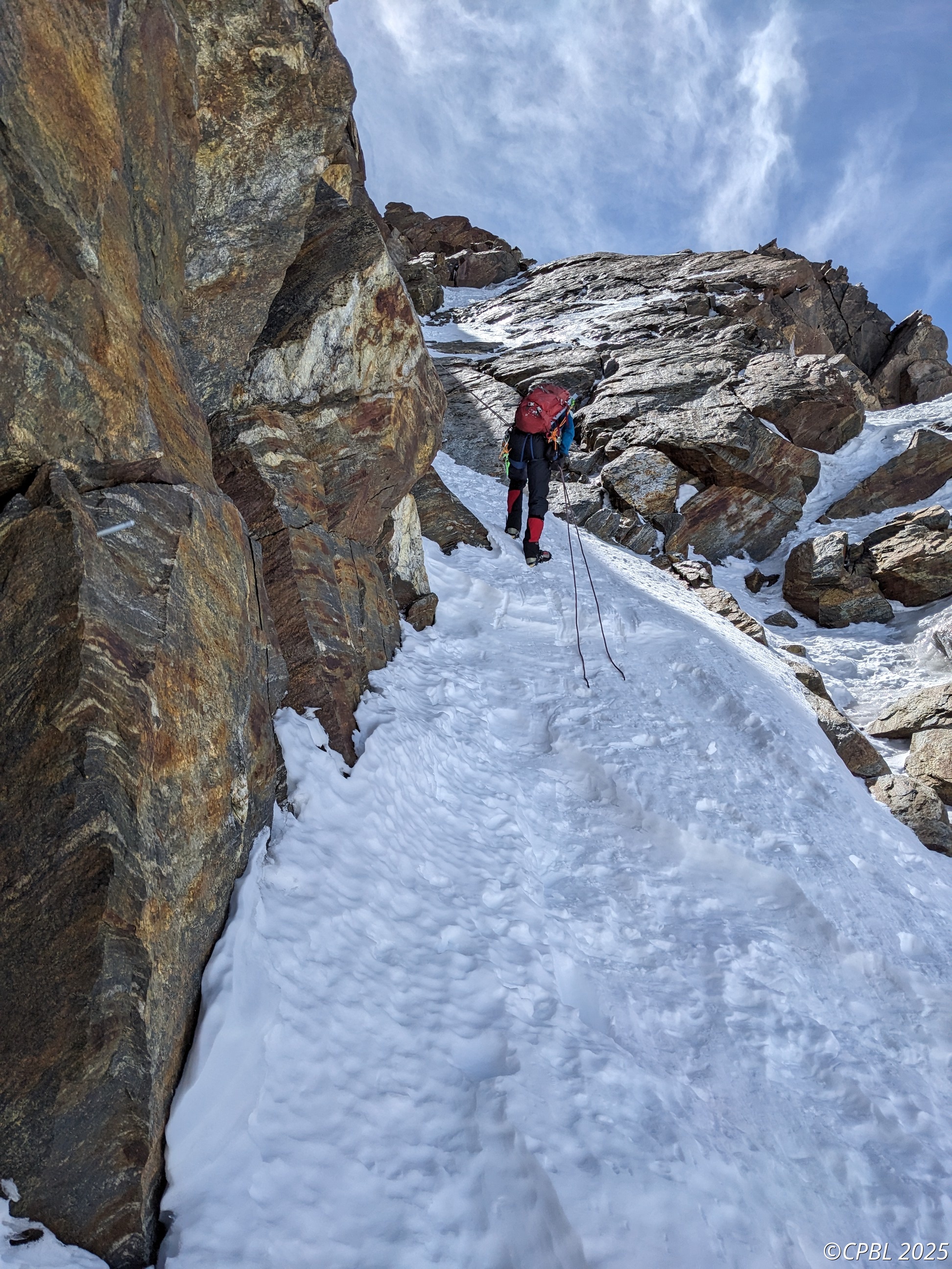 | ... glad there was no one climbing below us in this bowling alley couloir, ... |