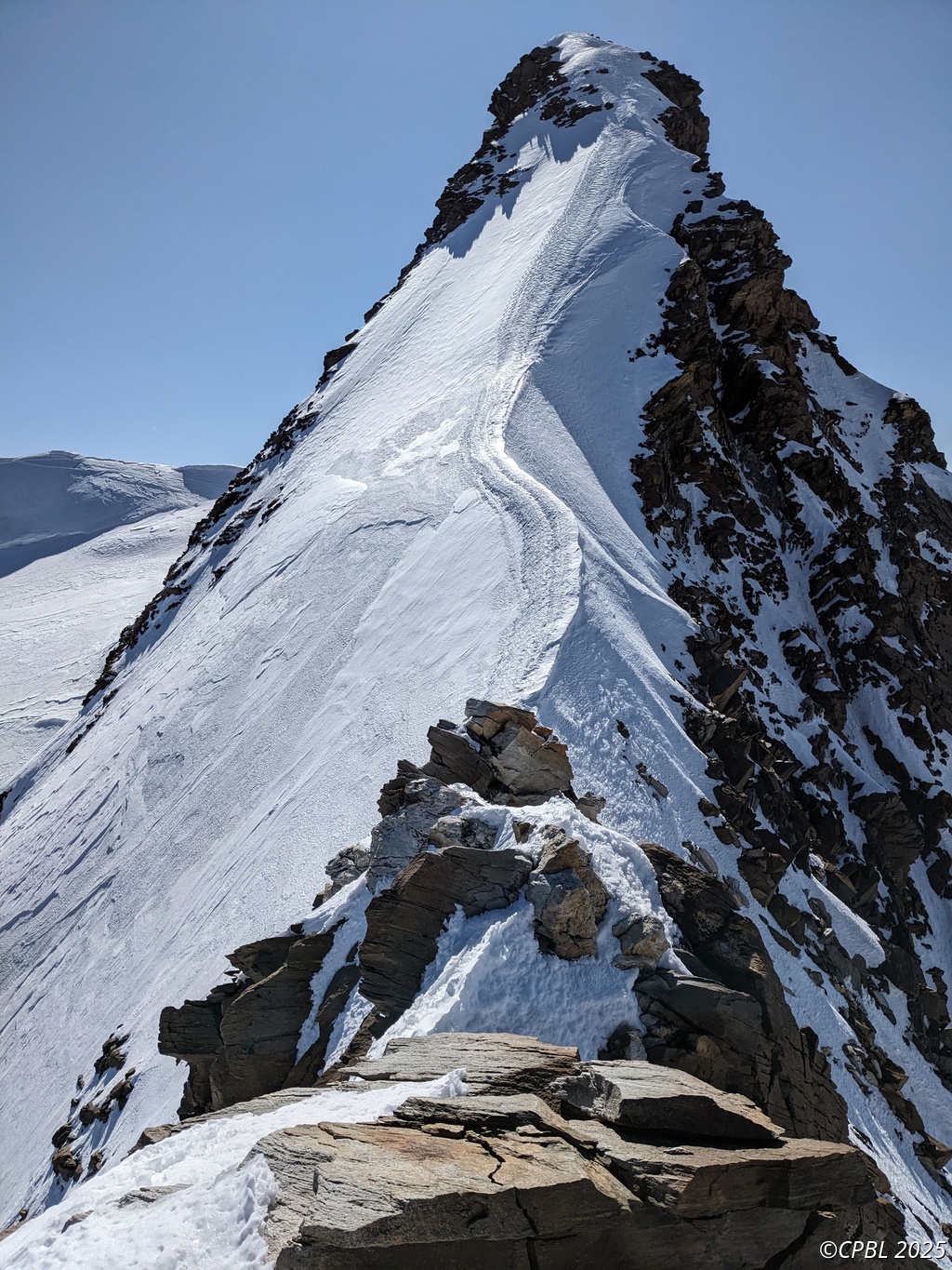 | With an easy bergschrund crossing, we gained the Sattel col to the right of what we had called the "triangular face", the snow slope accessing the West ridge. |