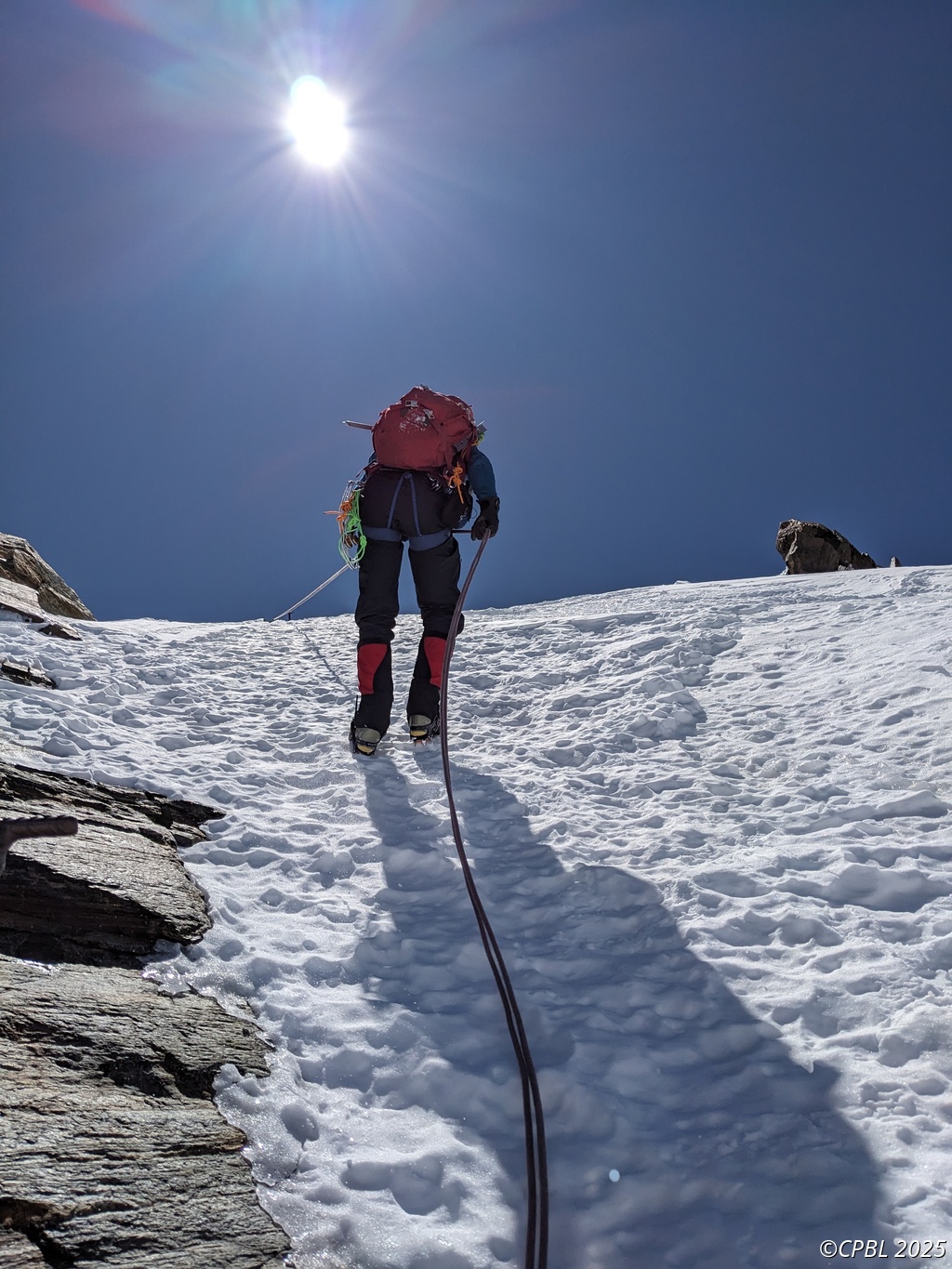 | ... we discussed plans and decided to rope up and protect the last steps of the rock section ... |