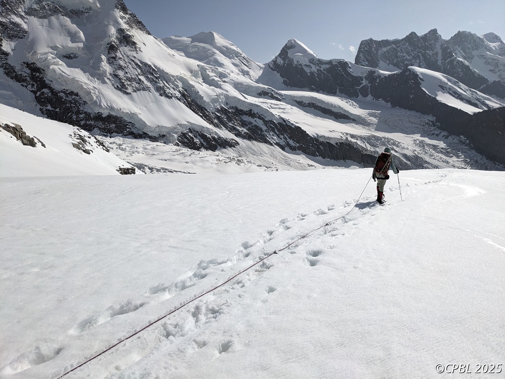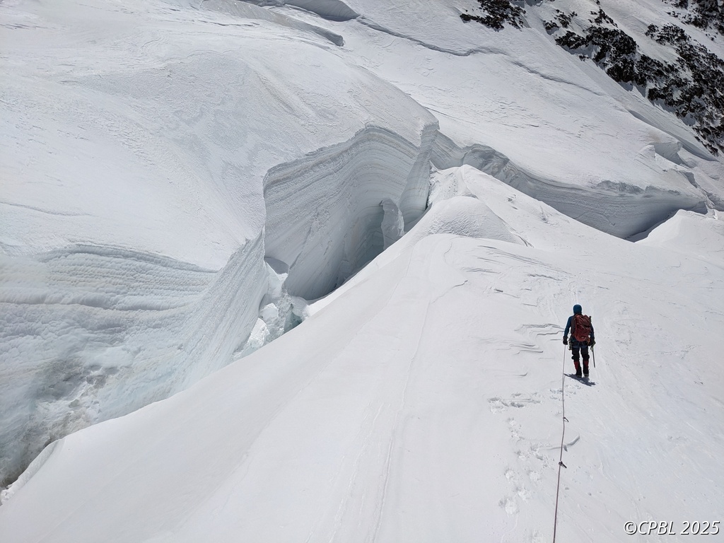 | Our goal was to camp above 4000m, rather than ascend in speedy style. Once one has probed out and demarcated a safe zone, one can unrope and set up camp. |