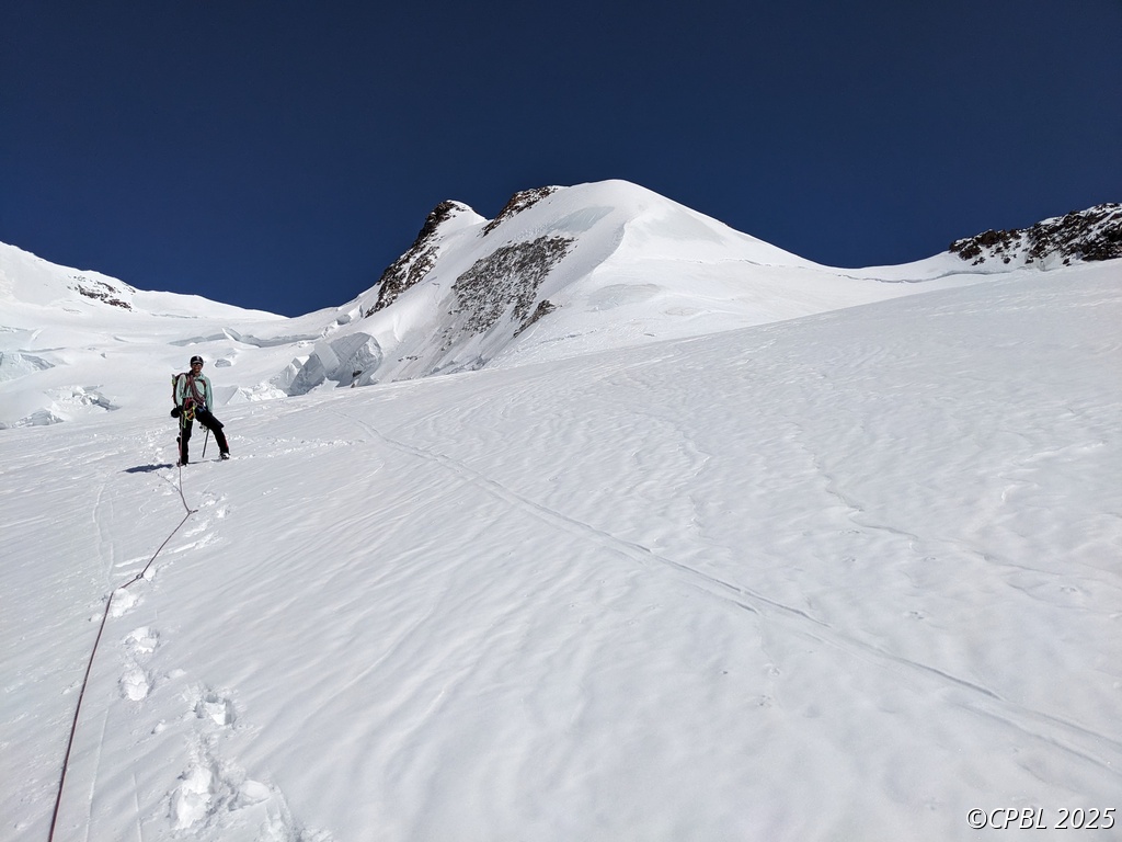 | From the Dufourspitze-Nordend col, we were back to crevasse avoidance navigation to get back around towards our camp. |